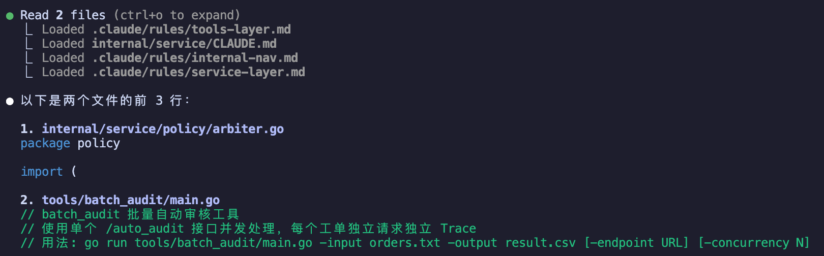 2026-03-31 18:00:13 path_glob_match .claude/rules/service-layer.md ['internal/service/**/*.go'] <- internal/service/policy/arbiter.go路径缩短:绝对路径自动去掉 cwd 前缀,转为相对路径,提高可读性。